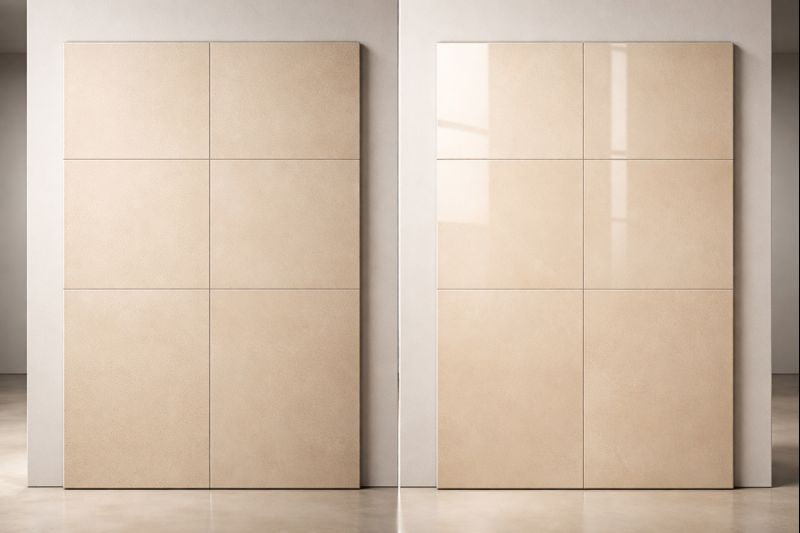 Для пола оптимальна матовая или слегка шероховатая поверхность — она безопаснее и практичнее в повседневной эксплуатации. На стенах эффективно смотрятся глянцевые и полуглянцевые форматы: они отражают свет и делают помещение более «воздушным».