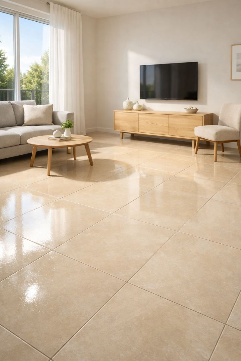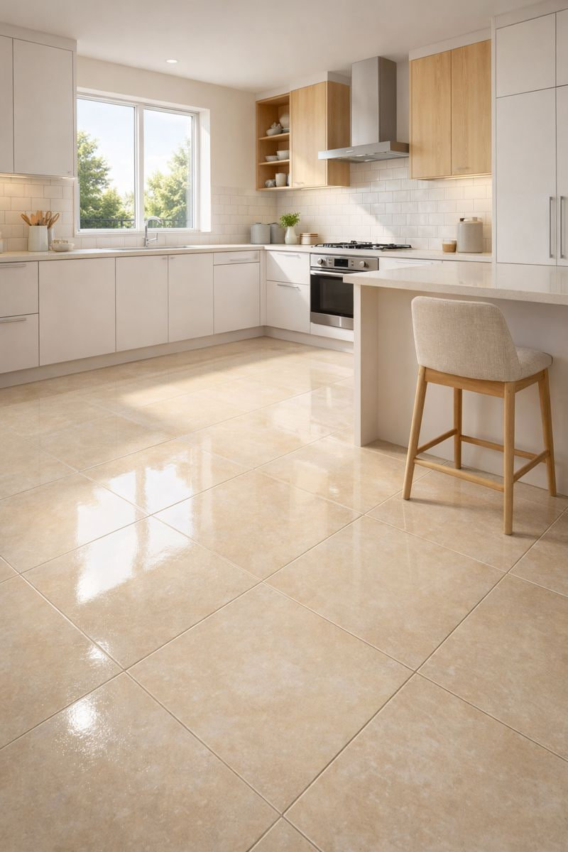 Керамогранит в бежевых тонах устойчив к влаге, царапинам и истиранию, что делает его практичным выбором для семей с детьми и домашними животными.