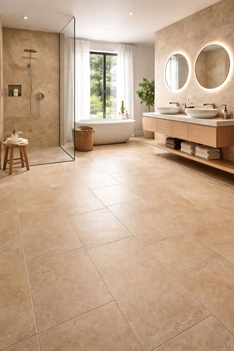 Бежевая плитка универсальна, однако максимальный эффект достигается при продуманной раскладке. Направление укладки, формат и сочетание фактур позволяют визуально менять пропорции помещения и делать его более просторным.